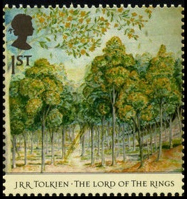Tolkien beschrijft in zijn boeken ‘The Lord of the Rings’ een bos in een brede vallei als het ‘Forest of Lothlórien’ als verzetscentrum van de Elfen tegen Sauron, die het slechte vertegenwoordigt, een antagonist. In de eerdere roman van Tolkien ‘The Hobbit’ wordt deze figuur omschreven als de ‘Necromanser’, iemand die de zwarte kunst uitoefent. Op de postzegel is het bos afgebeeld in de lentetijd.