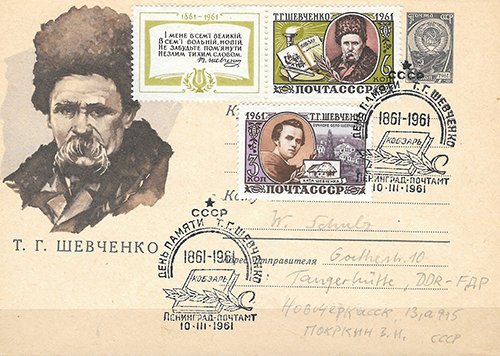 USSR 1961, 100e sterfjaar Taras Tsjevchenko. Brief van Moskou naar Tangerhütte (DDR). Vermelding ‘Kobzar’ op zegels en in stempel.