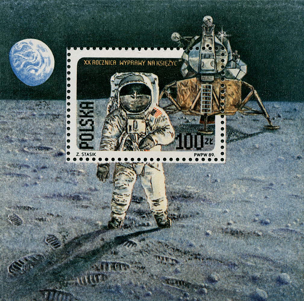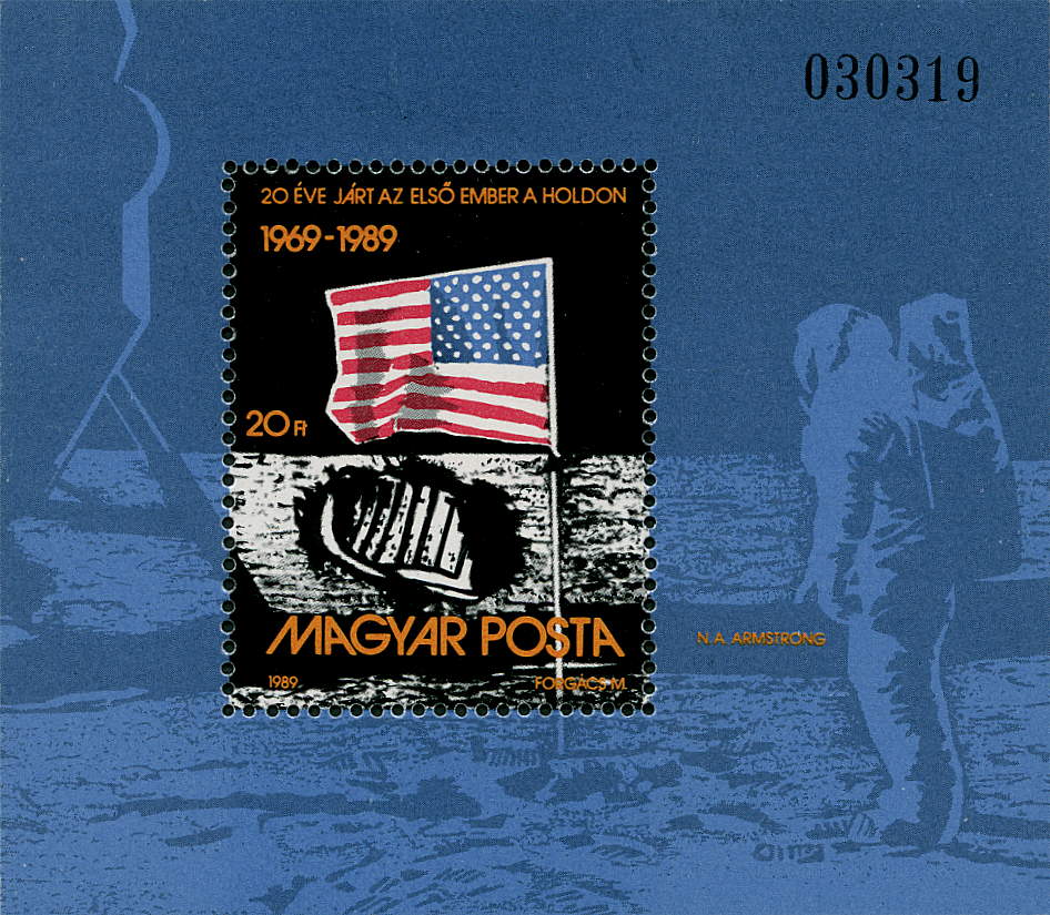 (Hongarije gaf deze zegel uit in 1989 (20 jaar herdenking maanlanding). Te zien: Amerikaanse vlag met voetafdruk van Aldrin, Aldrin die salueert naar de vlag, links staat de maanlander Eagle. Rechts staat de naam ‘N. A. Armstrong’, maar de man is in feite Aldrin die gefotografeerd wordt door Armstrong.)