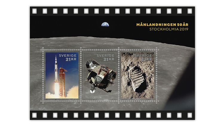 (Zweden (2019), alleen te koop tijdens Stockholmia 2019 (29 mei – 2 juni), velletje 50 jaar maanlanding met overprint Stockholmia 2019. De foto van de tweede en derde zegel zijn gemaakt met de Hasselblad camera).