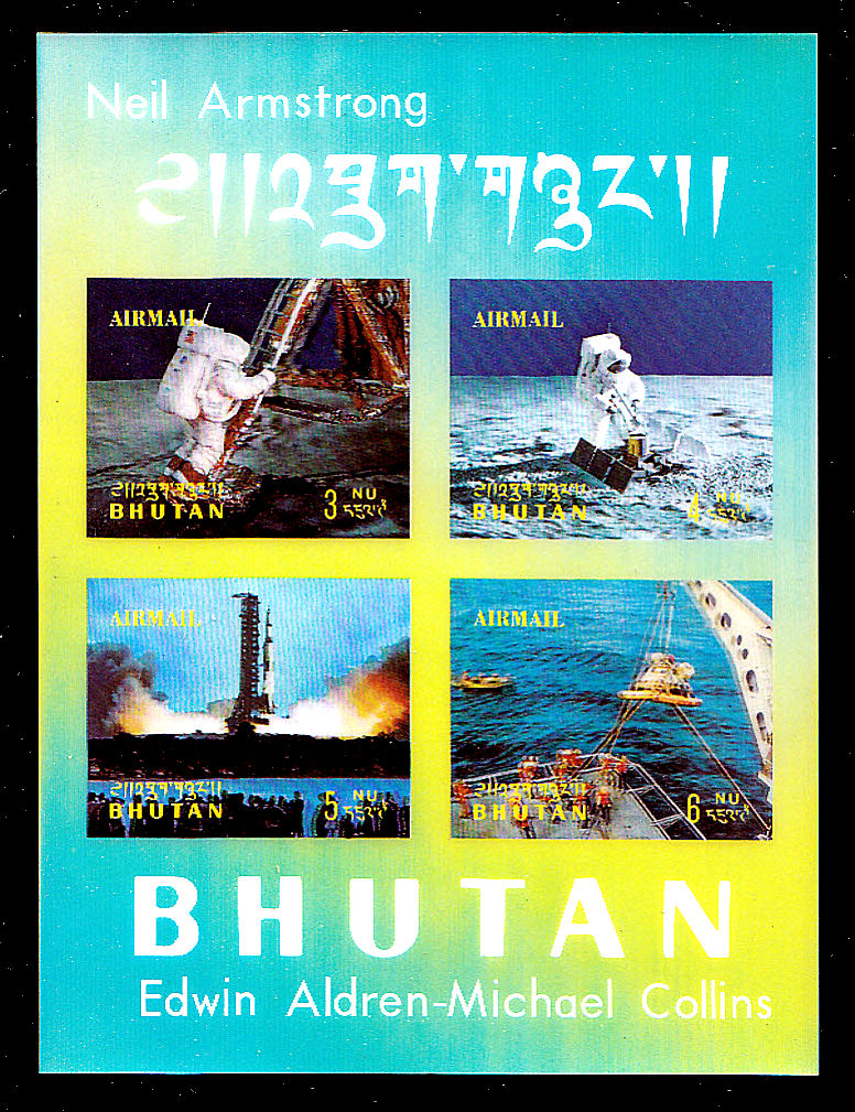 Bhutan gaf in 1969 drie velletjes uit als 3D Hologram. Hieronder het eerste vel. 3D velletjes met favoriete thema’s werden regelmatig uitgegeven door Bhutan.
