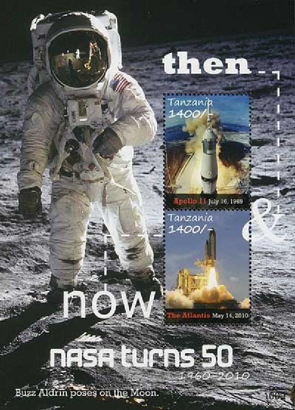 Amerika gebruikte de beroemde foto van Aldrin voor hun 50 jarige herdenkingszegel van 2019. Op de helm van Aldrin is Armstrong (fotograaf) te zien en de maanlander. Overigens niet erg origineel want andere landen gebruikten dezelfde foto voor hun eerdere uitgiften. Op de tweede USA zegel is met witte punt aangegeven op de maan de landingsplek ‘Sea of Tranquility’.