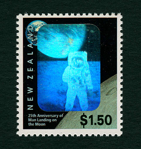 (De Nieuw-Zeelandse zegel uit 1994 is mijn favoriete 3D Hologram zegel. Te zien: Aldrin in ruimtepak staat op de maan, achter Aldrin is de aarde met prominent ‘Nieuw-Zeeland’ achter zijn hoofd).