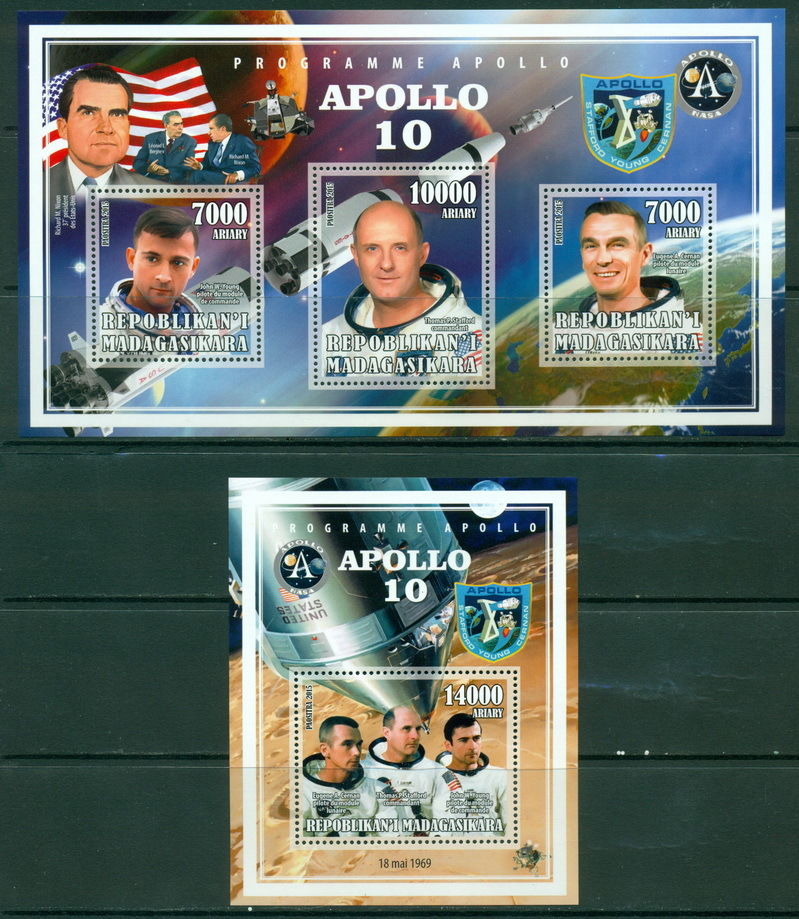 De zegels over de Apollo 10, met de naam Madagaskar er op gedrukt, zijn illegale zegels gedrukt door Russische criminelen.