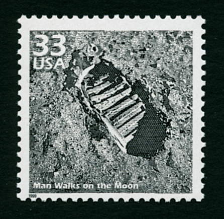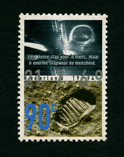 Beroemd zijn de voetafdrukken van Neil Armstrong (‘selfie’) op de maan, vereeuwigd op zegels van diverse landen. Overigens is de voetafdruk van de Nederlandse zegel van Aldrin.