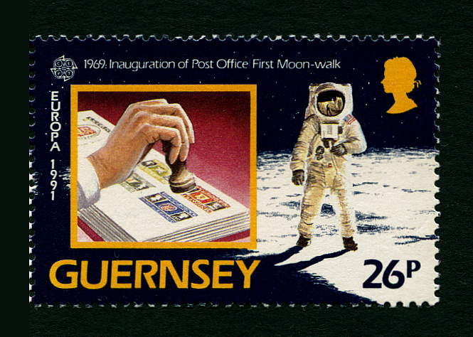 Het thema van Europa CEPT in 1991 was ‘Europa in de ruimte’. Guernsey gaf onderstaande zegel uit, want in 1969 (het jaar van de maanlanding) was ook het jaar dat Guernsey zelfstandig postzegels mocht uitgeven als land. Heel origineel bedacht van de ontwerpers.
