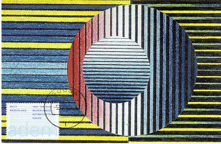 De (soms dichter bij elkaar komende) lijnstructuur van deze opticalart-kaart illustreert vervuiling onder en rechts in de cirkels, gelijk de onderkant van de postzegel.
