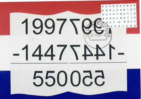 Op rekenkundige wijze (overeenkomstig werkmethode van deze Kamer) is op de maximumkaart (opengeslagen bladzijden van het jubileumboek) 1997 – 1447 = 550 jaar als jubileumperiode afgedrukt. De gespiegelde cijfernotatie symboliseert de veranderingen die door de eeuwen heen bij de Rekenkamer in Nederland zijn doorgevoerd.