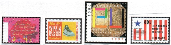 Er bestaat ook een meng- of tussenvorm van beide postzegelsoorten, waarin het figuratieve in gelijke mate aanwezig is als het typografische Ouderen- en zomerzegels: 1997 & 1998 (nvph 1716/19, 1757/60), Marshallhulp-zegels (nvph 1724) en Eurotopzegels (nvph 1726).