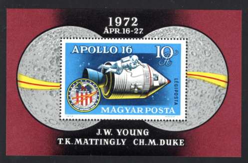 Apollo 16 was de vijfde missie van het Project Apollo waarbij op de maan werd geland. De landingsplaats was in ‘Descartes Highlands’. De bemanning bestond uit John W. Young (commandant), Charles Moss ‘Charlie’ Duke, Jr. (piloot maanlander) en Thomas K. Mattingly (piloot commando-module).