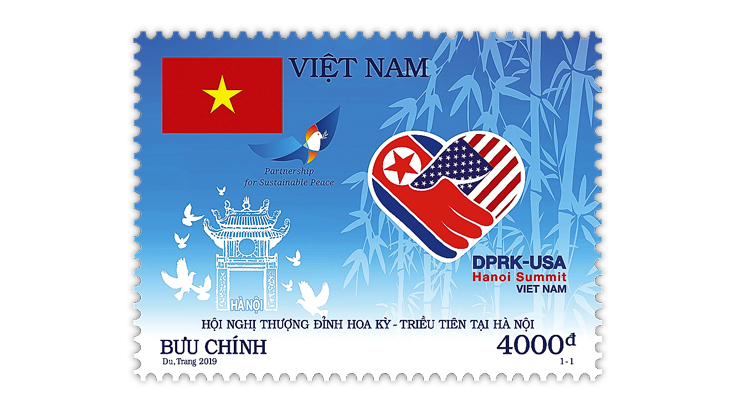 Het ontwerp bevat diverse symbolische elementen. Prominent aan de linkerbovenzijde staat de Vietnamese vlag. De vredesduif onder de vlag en de hart vorm ‘handshake’ in de vorm van de vlaggen van beide landen. Dan nog een aantal beelden van Vietnam. Een bamboe bos (rechts) en de Khue Van Cac, paviljoen in de Tempel van literatuur’ als symbool van Hanoi in 2012. Verder de tekst ‘Partnership for Sustainable Peace’ onder de duif en ‘DPRK-USA Hanoi Summit Vietnam’ aan de rechterkant.