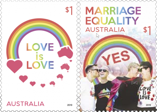 Australia Post heeft een serie van twee zegels (2 x $1) met als thema ‘Marriage equality’ (vertaald: gelijke rechten bij het huwelijk) uitgegeven op 1 oktober 2019. Vooral de eerste zegel is origineel qua ontwerp.