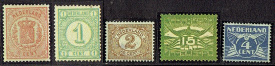 1. Nederlands rijkswapen met een krans van eiken-/laurierbladen op de verticale postzegel (nvph 13/8) en een randdecoratie in reliëf overeenkomend met een munt.