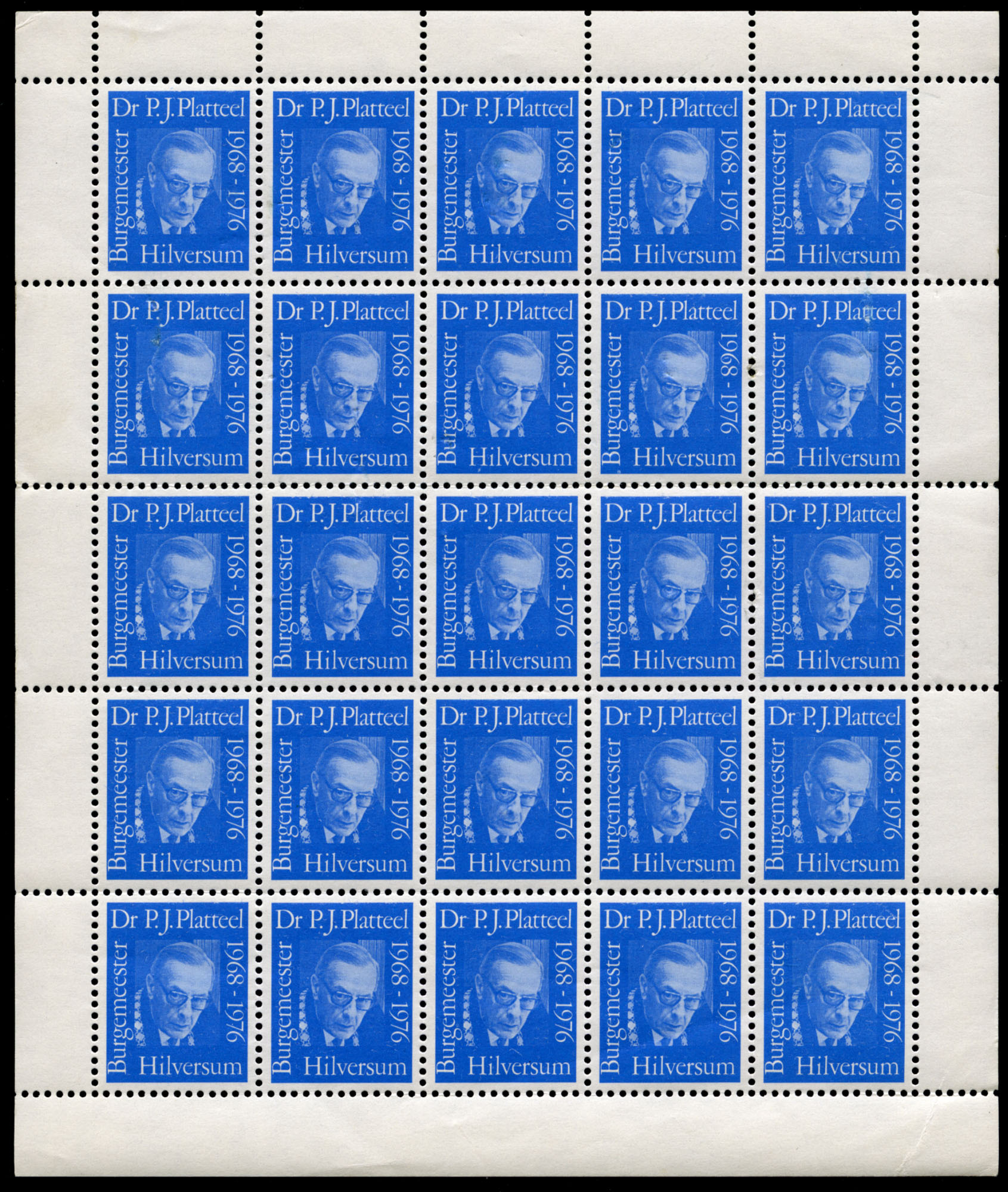 De zegel is uitgegeven in een velletje van 25 stuks en eenkleurig blauw. De tekst luidt: Burgemeester Dr. P.J. Platteel 1968-1976 Hilversum.