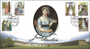Nadat haar vader in december 1800 had besloten zich terug te trekken uit het openbare leven verhuisde de familie naar Bath. Jane was daar absoluut niet gelukkig en van schrijven kwam niet veel terecht. Op bovenstaande eerstedag envelop is de Royal Crescent in Bath afgebeeld, maar daar heeft de familie Austen nooit gewoond. Wel in de buurt, op het adres Sydney Place nummer 4. Na het overlijden van haar vader op 21 januari 1805 gingen haar moeder, zusters en broers op zoek naar een nieuwe woning. Ze verbleven korte tijd in Worthing en Southampton.