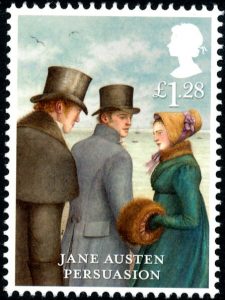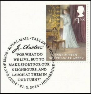 In het stempel voor de eerste dag van uitgifte van Royal Mail is een citaat opgenomen uit de roman ‘Pride and Prejudice’: For what do we live, but to make sport for our neighbors, and laugh at them in our turn? Moeilijk te vertalen maar het komt er denk ik op neer dat we grapjes maken over onze buren maar dat wij op onze beurt worden uitgelachen?