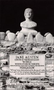 Op bovenstaande prentkaart is het borstbeeld te zien dat is opgesteld in de tuin van een ‘Tea Garden’ in het kustplaatsje Lyme Regis in het graafschap Dorset. Jane bracht hier een aantal maanden door in een huis met de naam ‘Wings’ waar ze de inspiratie opdeed om de roman ‘Persuasion’ te voltooien. In de roman komen passages voor met beschrijvingen van de straatjes in deze plaats.