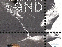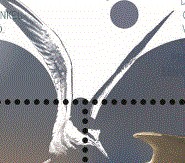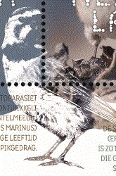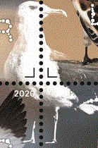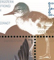 - De kluut met zwart-witte tekening en lange kromme snavel wil waarschijnlijk indruk maken op een andere kluut met hoog geheven vleugels. Linksboven in het wit een jonge kluut als jongste vogeltje van deze emissie.