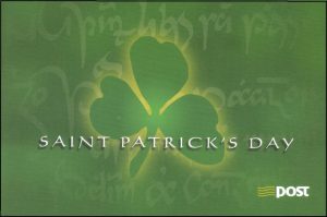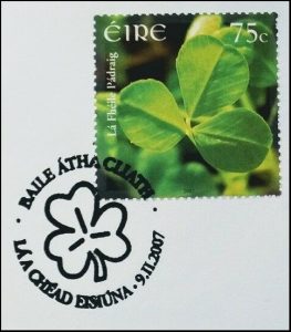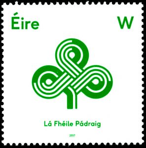De meest eenvoudige vorm van een ‘shamrock’ vond ik op een Ierse postzegel uit 2017 met de frankeerwaarde W voor Wereld. Maar in de afbeelding is tevens de bovenzijde van een staf te zien die behoort bij het beeld van Saint Patrick. Maar hoe werd klaver een symbool voor Ierland?