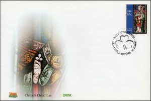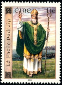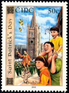 De parades rond ‘Saint Patrick’s Day’ worden in alle steden en dorpen in Ierland, ook in Noord-Ierland, gehouden. Zoals te zien is op de postzegel uitgegeven op 23 februari 2003 met een straatparade in Dublin. Op de achtergrond de St. Patrick’s Cathedral met de 43 meter hoge toren. De kerk is tussen 1191 en 1270 gebouwd op de plaats van een bron waar Saint Patrick vele Ieren die zich tot het Christendom hadden bekeerd, heeft gedoopt. In 1901 werd onder de kerk een bron ontdekt die was afgesloten met een steen waarop een Keltisch kruis te zien was.