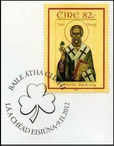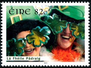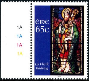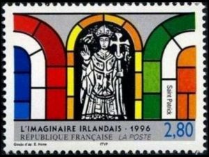 Op 16 maart 1996 gaf de Franse ‘La Poste’ een postzegel uit ter gelegenheid van het ‘Ierse Cultuurfestival’ dat toen werd georganiseerd. Als afbeelding werd een glasschildering van de Ierse kunstenares Evie Hone gebruikt die leefde van 1894 tot 1955. In het midden van de afbeelding Saint Patrick tussen de nationale kleuren van Frankrijk, rood wit en blauw en Ierland groen wit en oranje. De kleuren van de vlag van Ierland hebben een betekenis: groen voor de Ierse katholieken, Oranje voor de Ierse protestanten en wit als teken van vrede tussen de twee geloven.