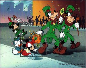 Ook Grenada, een ander Caribisch eiland, pikt een graantje mee met de viering van ‘Saint Patrick’s Day’, maar dat komt vooral doordat een katholieke parochie op dit eiland vernoemd is naar de heilige. Ook hier wordt op het strand een parade gehouden waaraan vele inwoners deelnemen. De kleur groen van de Disney figuren is correct, maar een klavertje-vier? En waar is Donald Duck?