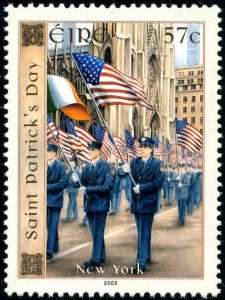 Omdat vele Ieren naar de Verenigde Staten zijn geëmigreerd, wordt ook in dat land ‘Saint Patrick’s Day’ gevierd met parades. Naast de Amerikaanse ‘Stars and Stripes’ wappert dan de Ierse nationale vlag. Zoals is te zien op de postzegel met daarop een parade in New York. En wist u dat tijdens ‘Saint Patrick’s Day’ in de Chicago River die door de gelijknamige stad stroomt, groen gekleurd water is te zien? En ook de fontein voor het Witte Huis in 2009 groen water spoot? Vele steden in de Verenigde Staten doen mee door openbaar water groen te kleuren en parades te houden. De eerste parade werd in Philadelphia gehouden in het jaar 1771. Een eeuwenoude traditie. Maar in Ierland vond de eerste parade pas plaats in het jaar 1903 in de oudste stad van Ierland, Waterford. Dus vele jaren later.