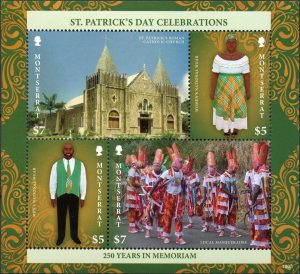 Buiten Ierland kent het Caribische eiland Montserrat ook een nationale feestdag die ‘Saint Patrick’s Day’ wordt genoemd. Op dit vulkanische eiland wonen zeer veel Ieren. In de 17de eeuw werd het eiland een toevluchtsoord voor Ierse katholieken die werden vervolgd op andere Caribische eilanden. Bij een telling rond 1678 bleek meer dan de helft van de bevolking van Ierse afkomst was. Op ‘Saint Patrick’s Day’ dragen de bewoners van het eiland traditionele klederdracht en worden gedurende tien dagen allerlei festiviteiten gehouden. Hierbij is groen de dominante kleur. In bars is dan ook groen gekleurd bier verkrijgbaar net als in Ierland! Het hierboven afgebeelde blokje werd uitgegeven in 2018 ter herinnering aan de mislukte opstand van slaven op het eiland in 1768 op ‘Saint Patrick’s Day’.