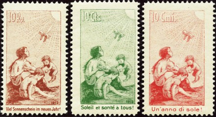 Voor- en achterkant van de Pro Juventute-postzegels 1912 uit Zwitserland met de vertaalde onderschriften ‘Veel zonneschijn in het nieuwe jaar’ en ‘Zon en gezondheid voor allen’. De aanwezigheid van kinderen op deze Zwitserse postzegels dienden als voorbeeld voor onze kinderzegels van 1924 om er ook een kind op te plaatsen.