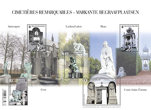 Op vijf zegels met de waardeaanduiding 2 (oplage 49.752) in een velletje worden begraafplaatsen/grafmonumenten verbeeld: het graf van de componist Franz De Vos te Gent; het mausoleum te Court-Saint-Etienne; De Denker (Rodin) te Brussel; het graf van H. Concience te Antwerpen en de ingang van de begraafplaats te Bergen.