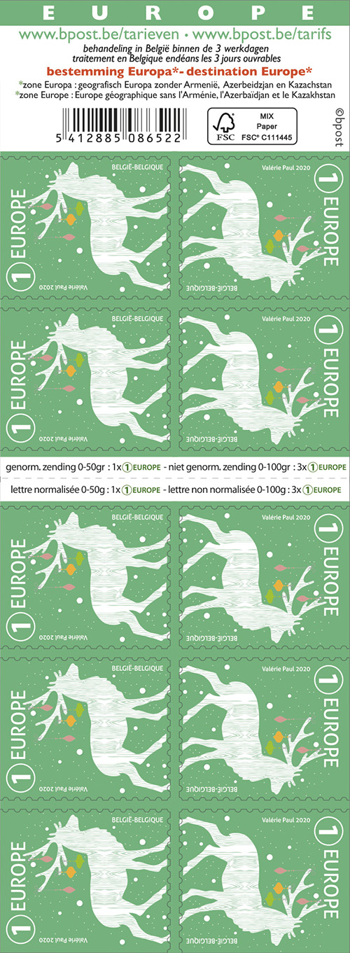 Tot slot verschenen twee verschillende boekjes met in elk tien kerstzegels waarop een rendier in de sneeuw. In het ene boekje voor binnenlands gebruik (waardeaanduiding 1) zijn de zegels rood, in het andere boekje met de waardeaanduiding 1 Europe groen. Het rode boekje heeft een oplage van 830.2001, het groene 88.446.