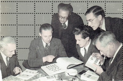 De Filacento-postzegelontwerper Gertjan Leuvelink vond tussen de familiefoto’s van zijn moeder een foto met een aantal verzamelaars rondom een tafel. Fotograaf-filatelist Hoffs heeft de foto genomen op een verenigingsbijeenkomst van de Filatelisten Vereniging Lochem in hotel Meenderink (van eigenaar Scholten, oom van de ontwerper) in 1949. De afgebeelde personen zijn van links naar rechts Hillebrandts, Scholten, Bak, Schaap, Engels en Gubbe.