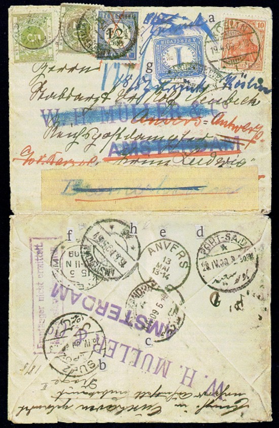 3. Op 26 april [b] kwam de brief in Suez aan, maar de brief was te laag gefrankeerd met een postzegel van 10 Pfennig (binnenlands tarief). Het buitenlandse tarief van 20 Pfennig was de vereiste. In Suez werd daarom 1 Piaster (12½ cent) port geheven met een blauwe portzegel, die niet werd afgestempeld.