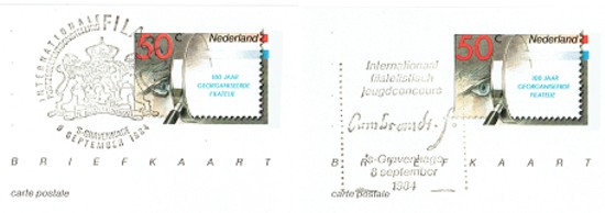 Het oog, gewapend met een vergrootglas, kijkt ingespannen naar een gedeelte van een postzegel, dat onder en rechts door de perforatie is afgebeeld. Rechts van het glas is een vaag horizontale uitstraling tussen oog en postzegel zichtbaar, die door het vergrootglas tot stand komt. De schuin geplaatste tekst ‘100 jaar georganiseerde filatelie’ versterkt letterlijk en figuurlijk de dynamische uitstraling van de postzegel voor de verzamelaar.