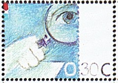 1. Met een loep in de hand boven een geschetst fragment van een postzegel tracht de ontwerper het beoogde doel te bereiken middels een vergrootglas met daarin een oog. De onderling elkaar ondersteunende relatie tussen de getekende onderdelen voor gedetailleerd nader postzegel-onderzoek is niet aanwezig.