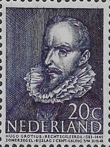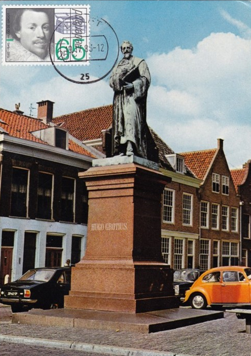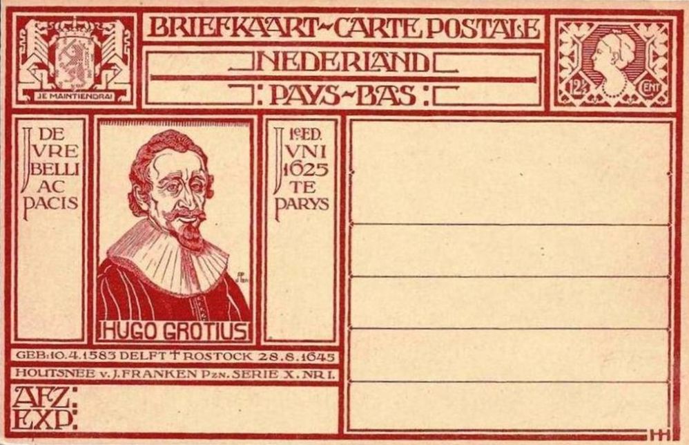 Hugo de Groot was een briljant jurist en legde de basis voor het volkenrecht. Zijn beroemdste werk is ‘De iure belli ac pacis’ (Over het recht van oorlog en vrede) uit 1625. Deze tekst zien we ook op onderstaande briefkaart uit 1925. Internationaal stond Hugo de Groot bekend als Hugo Grotius.