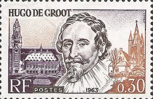 Een van de zegels die je laat zien, de Franse, heb ik in mijn verzameling ontwerpfouten zitten. Daarop staat rechts achter de staatsman een afbeelding van de Oude Kerk van Delft, terwijl De Groot begraven ligt in de Nieuwe Kerk…