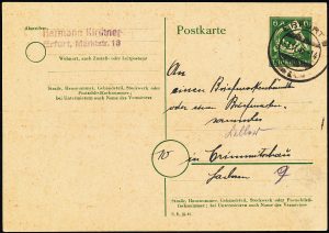 De tweede afgebeelde briefkaart werd op 3 november 1945 verzonden vanuit Erfurt. De kaart is gericht aan ‘een postzegelhandelaar of een postzegelverzamelaar’ in Sachsen. De afzender verzoekt toezending van de postzegels die door Sachsen in 1945 zijn uitgegeven. Een straatnaam en huisnummer van de geadresseerde ontbreekt, alleen de plaatsnaam Crimmitschau is vermeld. Deze stad in West-Sachsen had in 1945 ongeveer 30.000 inwoners. Hermann Kirchner, de afzender, had een postzegelwinkeltje in Erfurt aan de Marktstrasse. Het winkeltje bestaat nog steeds maar postzegels zijn daar niet meer te koop.