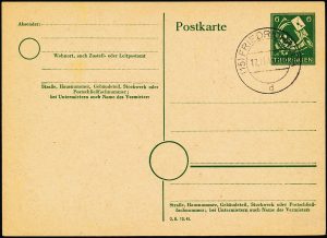 Het was niet de postzegel in vellen die als eerste van de serie van acht frankeerwaarden werd uitgegeven, maar een briefkaart waarop een afdruk van de zegel van zes Pfennig was aangebracht. Deze briefkaart werd gedrukt door de ‘Ohlenroth’sche Buchdruckerei’ in Erfurt. De oplage was 1.650.000 exemplaren. De briefkaart kan in formaat wel negen millimeter afwijken van het ‘normale’ formaat van 120 bij 100 millimeter en de kleur van het bruingetinte briefkaartkarton kan licht of donkerder zijn. Ook de kleur groen kan variëren van licht tot donker groen. De uitgiftedatum was 22 september 1945. De afgebeelde briefkaart is niet verzonden door een verzamelaar uit Friedrichroda maar behouden voor zijn of haar postzegelcollectie. De briefkaart is op verzoek voorzien van een afdruk van het poststempel van die stad. De datum in het stempel is 17 november 1945. Niet de eerste dag van uitgifte van de briefkaart, maar wel de eerste dag van verkrijgbaarheid van de kaart op het postkantoor van Friedrichroda.