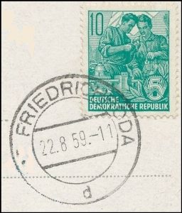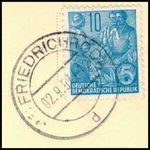 Het in november 1945 afgedrukte poststempel van Friedrichroda (met postnummer 15 voor Thüringen) was in september 1957 nog in gebruik, waarbij het postnummer was weggehaald. Nog wel is te zien waar dat nummer zich bevond. In augustus 1959 was dit stempel nog steeds aanwezig.