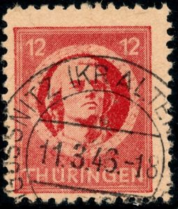 De tweede postzegel die werd uitgegeven had een frankeerwaarde van 12 Pfennig, het tarief voor een brief tot 20 gram. Als afbeelding had Schoner gekozen voor de arts, dichter, filosoof en toneelschrijver Friedrich Schiller, overleden op 9 mei 1805 op 45-jarige leeftijd in Weimar. Schiller staat ook bekend als Friedrich von Schiller, omdat hij in 1802 in de Duitse adelstand was verheven. Ook deze postzegel werd door de drukkerij in Erfurt gedrukt in boekdruk met een oplage van 27.000.000 stuks. De postzegelvellen werden voorzien van volle, gladde gom. Daarnaast werden postzegelvellen voorzien van zogenoemde ‘bespaargom’ waarbij de gom in een soort raster werd aangebracht. De uitgiftedatum was 19 oktober 1945.