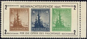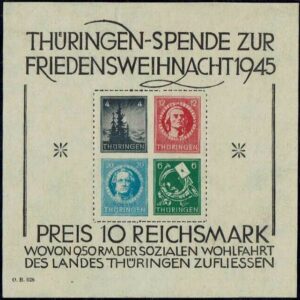 Drie zegels van 3, 4 en 5 Pfennig gedrukt in vellen van zes blokjes verscheen op 18 december 1945 een blokje voor een loketprijs van 2 Reichsmark. De opbrengst was bestemd voor slachtoffers van het fascistische regiem. De bedoeling was dat de zegels ter frankering van kerstwensen (8 Pfennig) of brieven (12 Pfennig) konden worden gebruikt door de zegels uit te knippen. De oplage bedroeg 32.200 blokjes en werd in boekdruk vervaardigd door de ‘Ohlenroth’sche Buchdruckerei’ van Georg Richters in Erfurt.