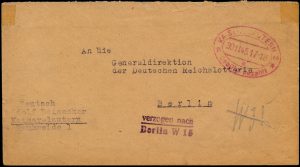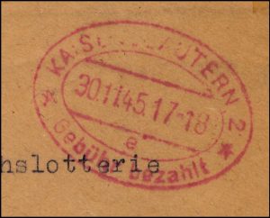 Postzegels waren niet beschikbaar en het porto voor te verzenden brieven moest met contant geld aan de postloketten worden betaald. Daarna werd een stempelafdruk aangebracht met de tekst: ‘Gebühr bezahlt’. Zoals het voorbeeld van de brief verzonden vanuit Kaiserslautern in de deelstaat Rijnland-Palts op 30 november 1945 naar Berlijn. Geen adres van de geadresseerde op de envelop. In 1944 was de Deutsche Reichslotterie nog gevestigd aan de Bayerischer Platz 14, Berlin W 30 in het stadsdeel Schöneberg. Door een van de zwaarste luchtbombardementen op Berlijn, op 3 februari 1945, was dit gebied, inclusief het nabijgelegen ondergrondse station van de U-Bahn, volledig verwoest. Hier vielen toen in het station, dat als schuilplaats bij luchtalarm diende, 63 doden. De brief werd doorgezonden naar stadsdeel Berlin W 15 Charlottenburg. De straatnaam Rauhweide 1 in Kaiserslautern bestaat niet meer.