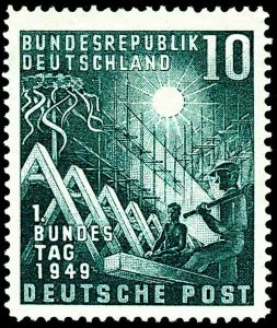 Onder Amerikaanse en Britse druk werkte Frankrijk vanaf augustus 1948 intensief samen met de Brits-Amerikaanse Bizone. Hierdoor ontstond op 8 april 1949 de Trizone, die op 23 mei 1949 overging in de Bondsrepubliek Duitsland. De eerste twee postzegels verschenen op 7 september 1949 met een afbeelding van een bouwwerk waarvan het hoogste punt is bereikt met het zogenoemde ‘Richtfest’. De ‘Richtbaum’, de krans met slingers op de paal is links te zien met op de achtergrond steigers. In Nederland spreekt men over ‘pannenbier’, maar hier had de afbeelding meer betrekking op de bijeenkomst van de eerste Bondsdag, een ‘hoogtepunt’ in de geschiedenis van de Bondsrepubliek Duitsland.