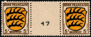 De eerste postzegels voor de Franse bezettingszone hadden de waarden van 10, 12, 20 en 30 Pfennig. Het waren de wapens van de deelstaten Rheinland, Pfaltz, Württemberg en Baden. Waarom de term ‘Briefpost’ op de serie postzegels werd aangebracht is niet duidelijk.