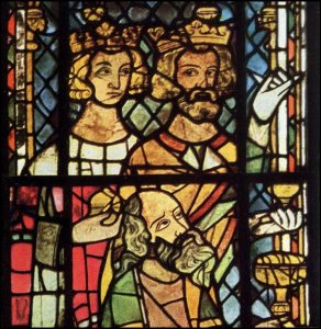 Ook hier is een fragment uit een glas-in-loodraam duidelijk herkenbaar in beeld gebracht op de uitsnede van een prentkaart. De drie koningen is een veelvoorkomende afbeelding in de vensters van de kathedraal. Het toont de middeleeuwse opvattingen over de bijbel en het oude testament. Het venster werd vervaardigd in het jaar 1508.