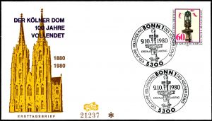 De voltooiing van de torens en daarmee van de kathedraal werd op 15 oktober 1880 gevierd nadat de laatste kruisbloem op de top van de toren was aangebracht. Dit is te zien op de postzegel en in de stempelafdruk op boven afgebeelde eerstedagenvelop van 9 oktober 1980. Een kruisbloem is een gebeeldhouwd versieringselement in de vorm van een kruis en werd meestal gebruikt als bekroning van pinakels, torenspitsen of geveltoppen tijdens de gotische bouwperiode.