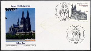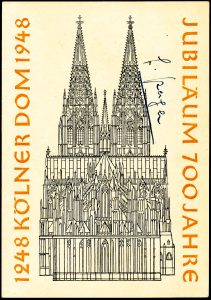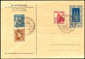 Een serie van vier postzegels werd op 15 augustus 1948 uitgegeven door de Deutsche Post in het door de Britse en Amerikaanse legers bezette deel van Duitsland. Dit ter gelegenheid van het 700-jarige bestaan van de Dom van Keulen. Het waren postzegels van 6, 12, 24 en 50 Pfennig met een toeslag. De postzegels werden gedrukt in boekdruk door Drukkerij Georg Westermann in Braunschweig. De zegel van 24 +16 Pfennig werd ontworpen door August Hussmann.