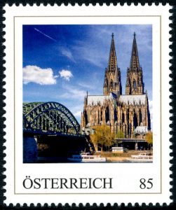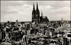 Tijdens de Tweede Wereldoorlog werd Keulen vele malen gebombardeerd. Belangrijk doelen waren de tussen 1907 en 1911 gebouwde Hohenzollernbrücke, een spoorbrug over de Rijn vlak voor de kathedraal, en het hoofdstation. Een deel van de brug is te zien op de persoonlijke postzegel van Oostenrijk. Vrijwel de gehele binnenstad van Keulen werd weggevaagd door brisant- en brandbommen. Op de prentkaart zijn de verwoestingen van de binnenstad rondom de Dom van Keulen goed te zien. De Dom van Keulen werd in het begin van de oorlog gespaard door de geallieerde piloten omdat het een uitstekend oriëntatiepunt was om op de te bombarderen doelen aan te vliegen.