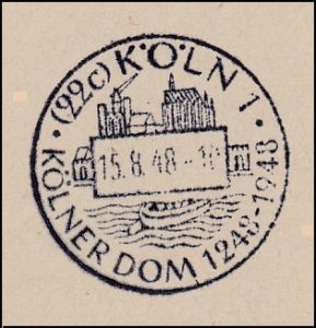 Een speciaal stempel voor de uitgifte van de vier postzegels op 15 augustus 1948 werd in een tijdelijk postkantoor bij de Dom in Keulen gebruikt. In het stempel is de Dom van Keulen afgebeeld waarbij het middenschip voor een deel ontbreekt, dus de toestand van de kathedraal tijdens de bouw in de veertiende eeuw. De afbeelding van de kathedraal is niet correct in het stempel opgenomen omdat in werkelijkheid het koorgedeelte naar de Rijn is gekeerd en niet de zijkant van het kerkgebouw.